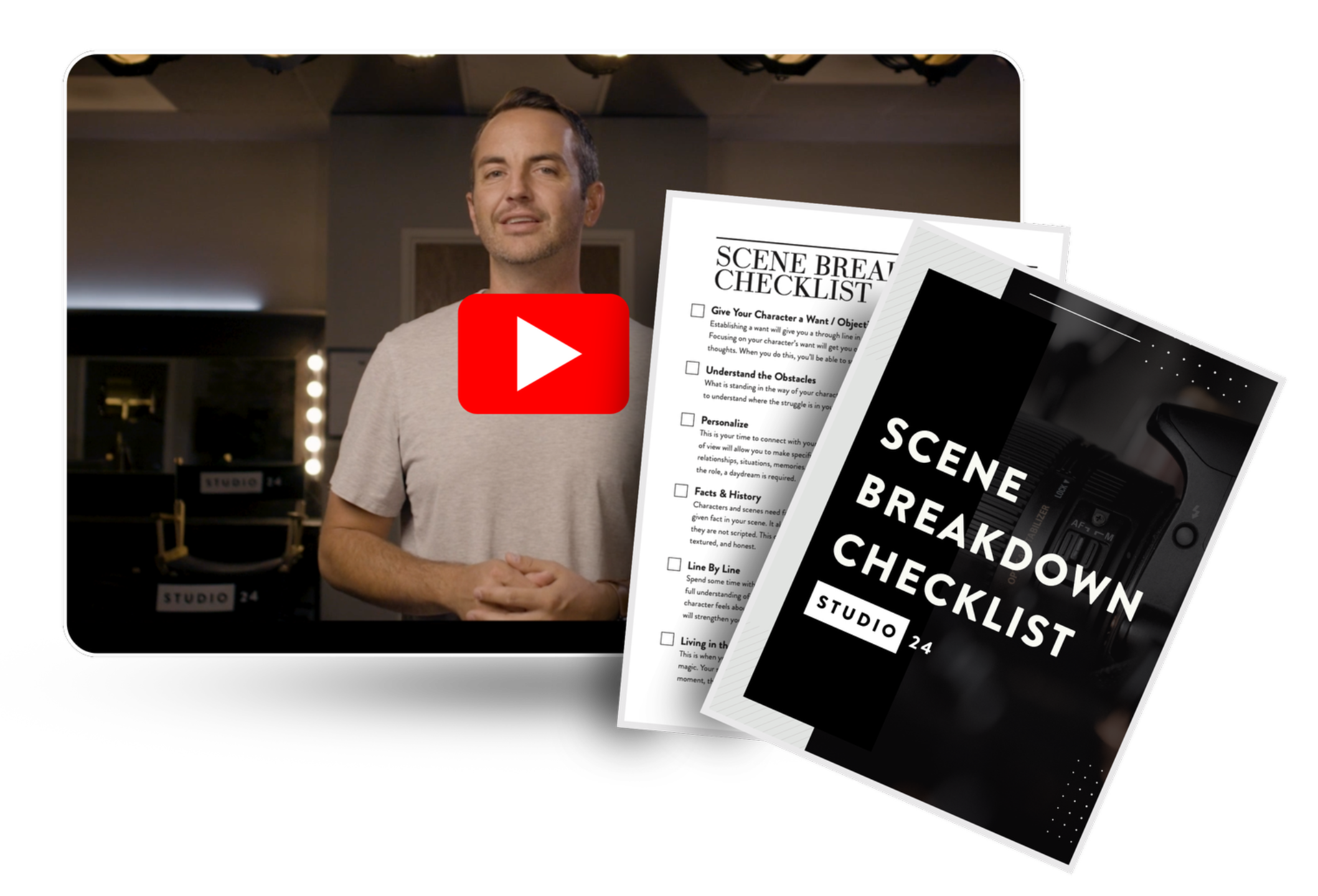 With Studio 24’s Scene Breakdown Checklist and step by step video guide, you’ll learn how to dig deep into every scene, add rich detail, and make bold, specific choices that elevate your acting and leave a lasting impact—every single time.